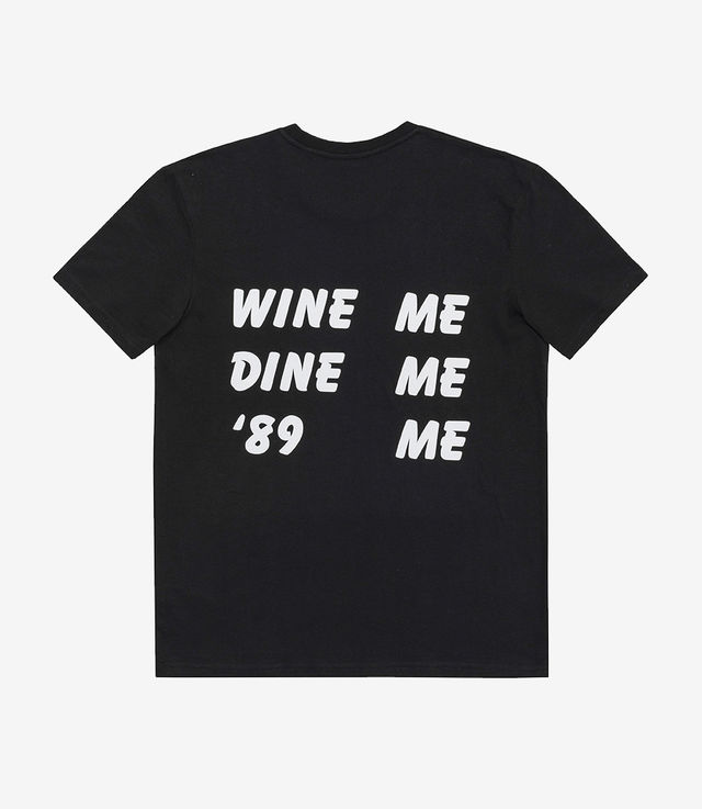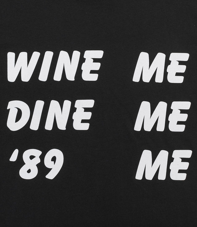 - Printed quote “WINE ME DINE ME '89 ME” at the back