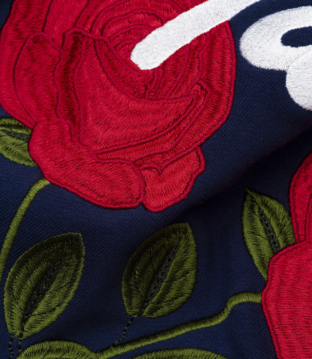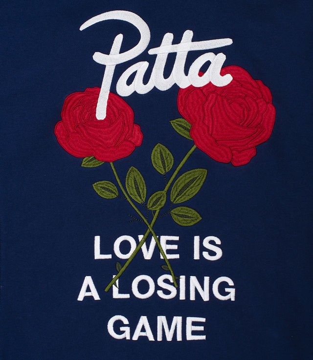 - Embroidered graphics with two red roses and the quote “Love is a Losing Game”