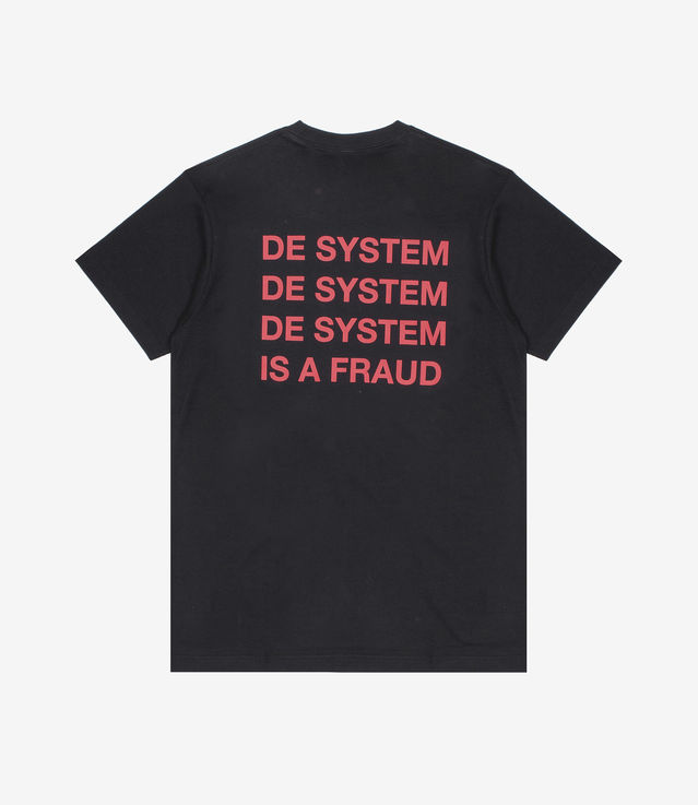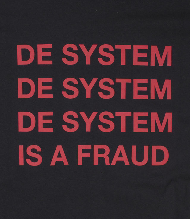 - Printed slogan at the back “De System, De System, De System is a fraud”