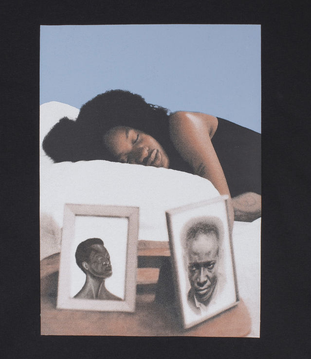- Photoprint with a woman sleeping with two framed photos of people like Anton de Komat — poet, writer and Surinamese resistance fighter