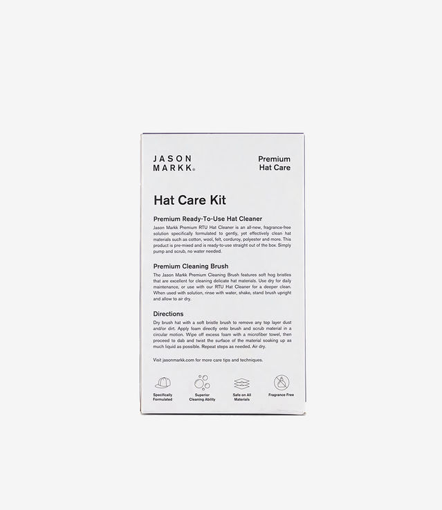 Stay clean from head to toe. The Jason Markk Hat Care Kit includes an all-new, fragrance-free solution specifically formulated to gently, yet effectively clean hat materials, along with signature soft-bristled Premium Brush. This gentle new formula is safe to use on cotton, wool, felt, corduroy, polyester and more. Designed for quick and easy care, Ready-To-Use Hat Cleaner dispenses the perfect ratio of solution to water for the most effective clean every single time.