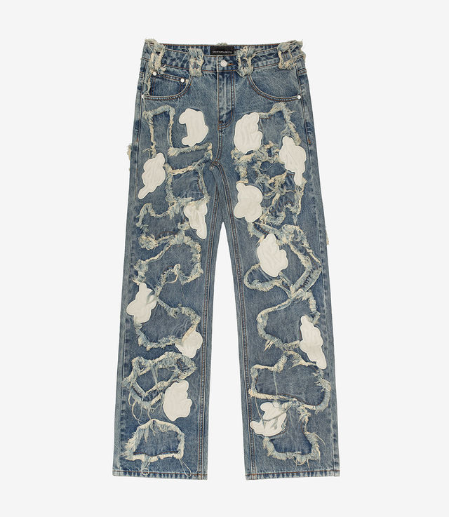 - Distressed denim and embossed vegan leather patches all over.