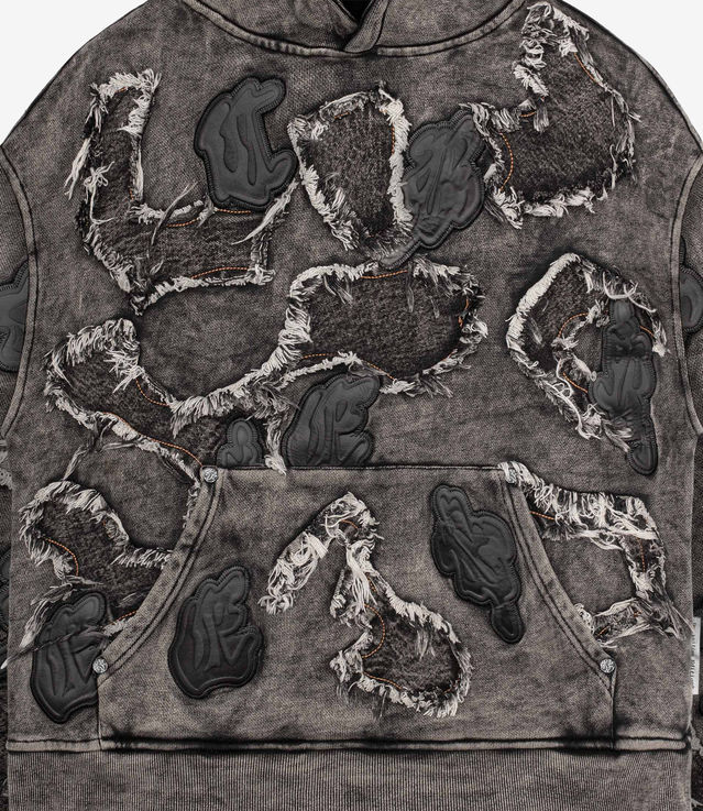 - Distressed denim and embossed vegan leather patches all over