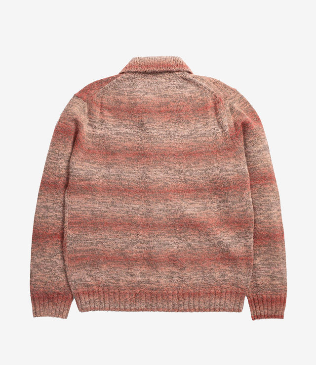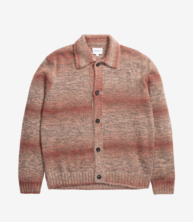 A jacket style knitted from a blend of cotton, mohair, alpaca and polyamide which varies in colour gradation. It features a set-in sleeve, a button through placket with full needle collar and a 3x3 rib hem and cuffs.