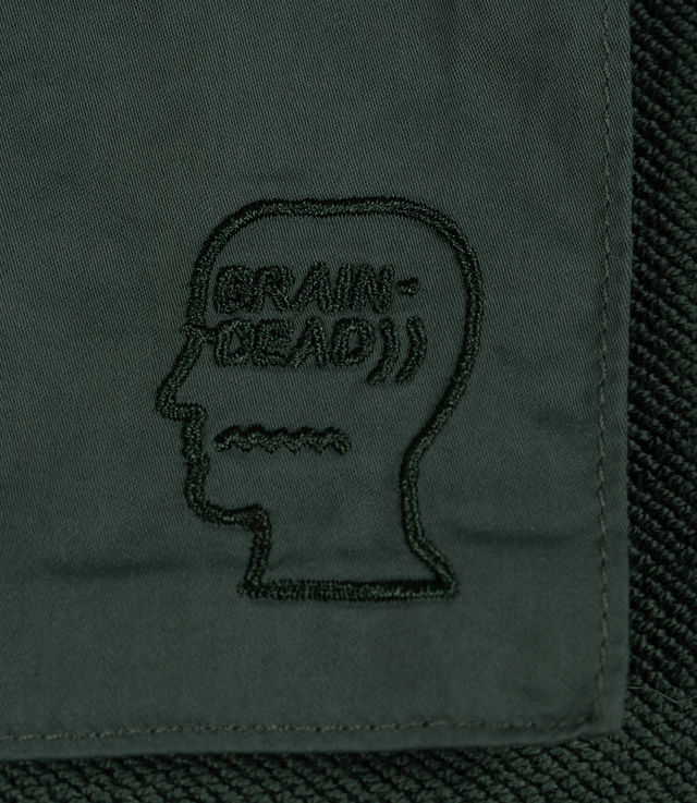 Brain Dead heavyweight cotton sateen button up shirt with chest pockets and tonal logohead embroidery.