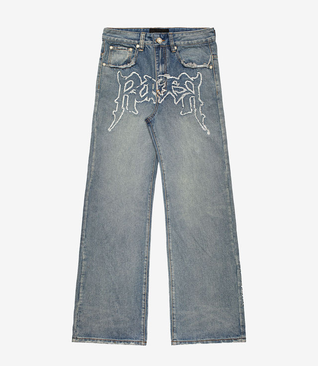 Loose-fit, non-stretch. Distressed bottom hems and pocket edges. Signature Racer metallic hardware. Pony-Hair style calf-leather patch. YKK zip-fly. Racer pattern pocket lining. Silver thread embroidery on the front crotch and at the bottom of the left leg. Heavyweight denim. Unisex.
