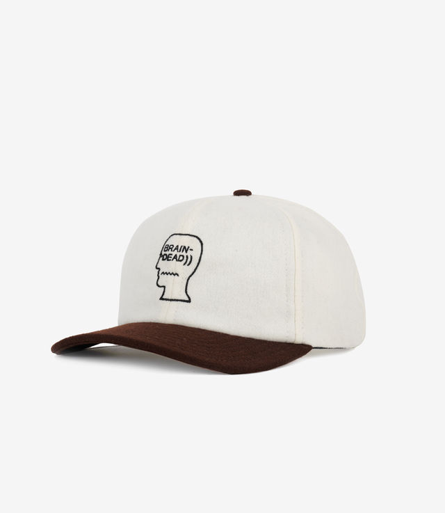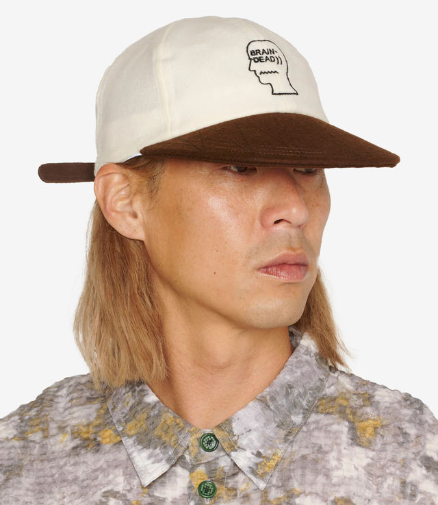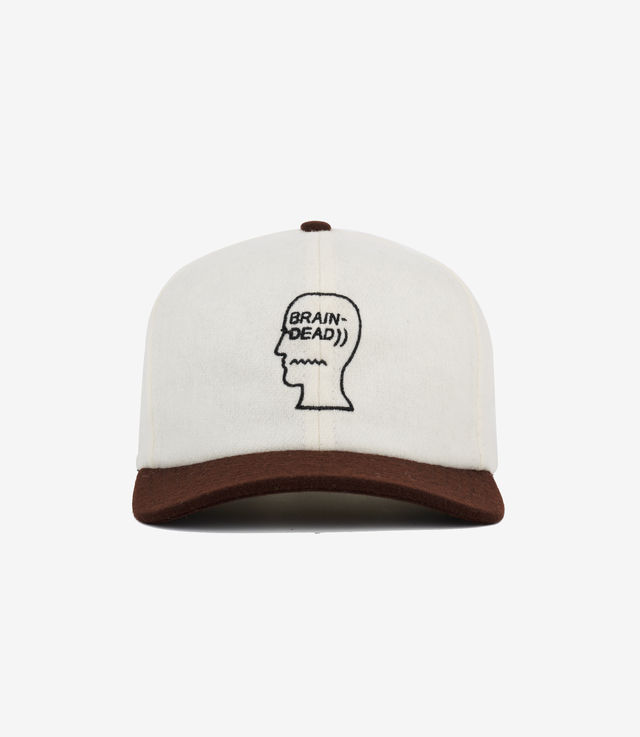 Brain Dead flannel 6-panel strapback hat with contrasting duck bill brim. Brain Dead logohead embroidered on the front.