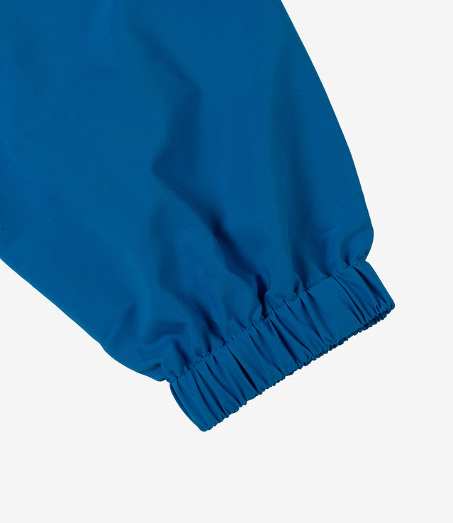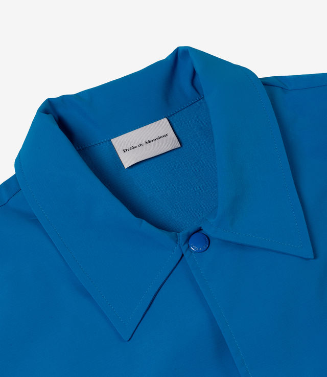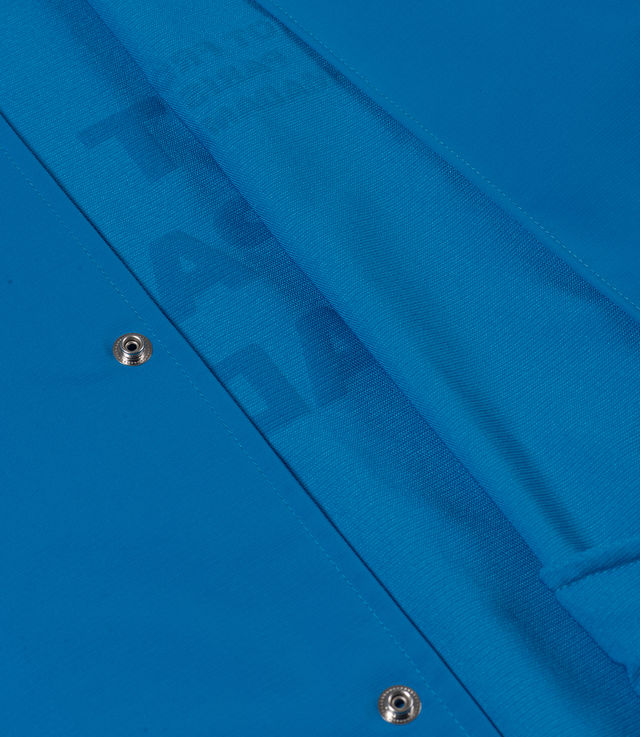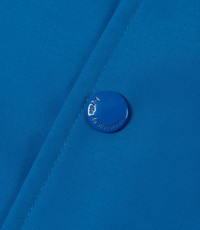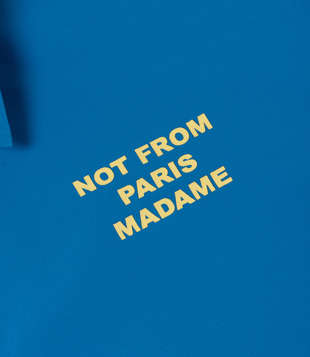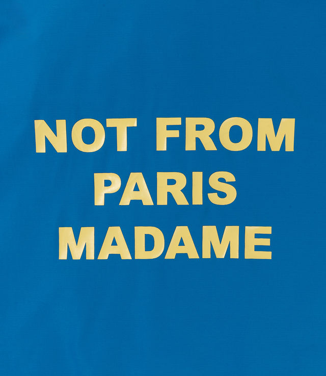 Slogan in color. This sky blue jacket in water-repellent technical fabric is printed with the 'Not From Paris Madame' slogan front and back. It has engraved snap buttons and elasticated wrists.