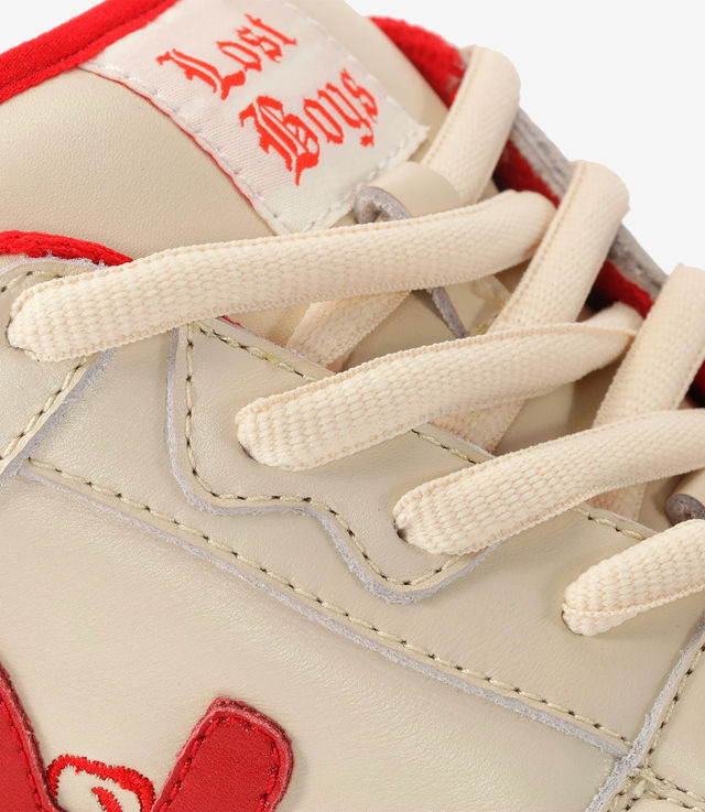 - The shoes are cream white with red details all around