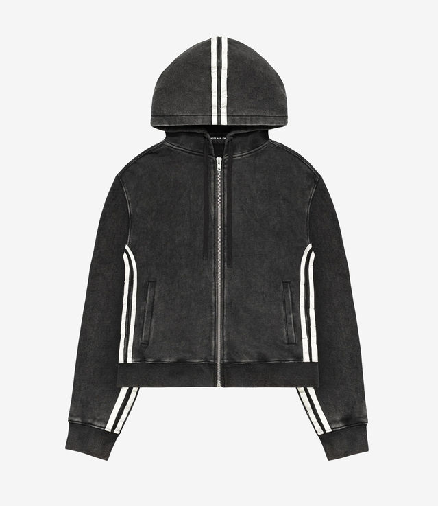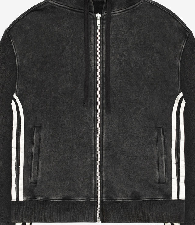 Zip hoodie with distressed golden stripes along the sleeves and the back of the garment. Garment dye and spray treatment. Rib-knit cuffs and bottom hem. Double-layered hood. Slightly oversized. Unisex.