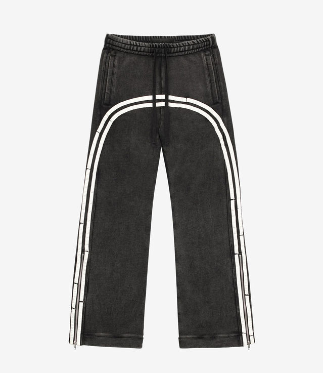 Sweatpants with distressed silver stripes along the sides and joining at the front. Stone-washed and spray treatment. The elastic waistband is adjustable with a drawstring. Zippers on the sides open for a flared look. Straight, slightly oversized fit. Unisex.
