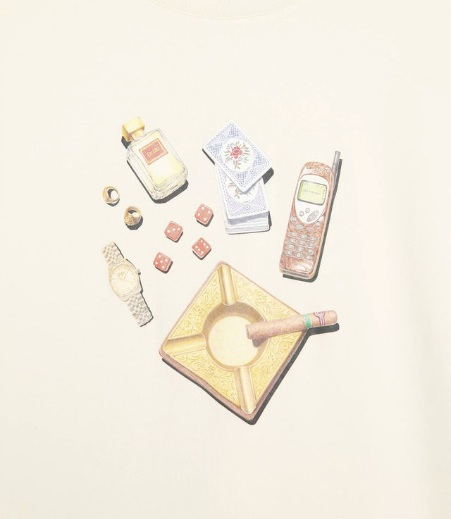 This cream 100% cotton interlock t-shirt with a ribbed neckline features the 'Soirée' print on the front. Made in Portugal.