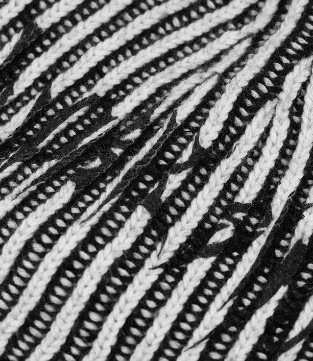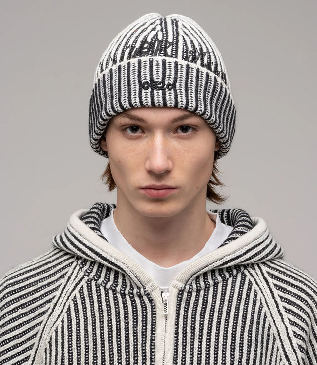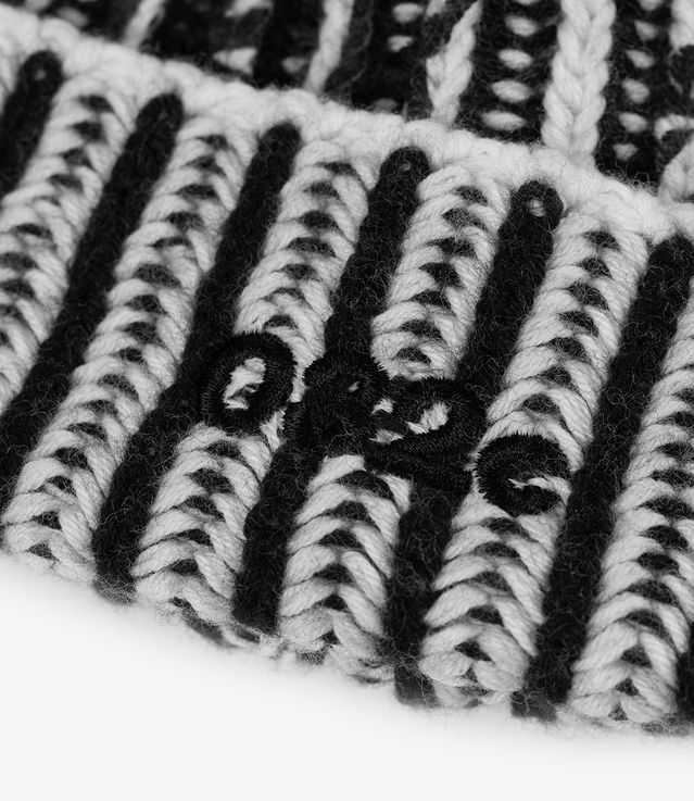 - Bi-color chunky ribbed beanie with multi technique artwork details.