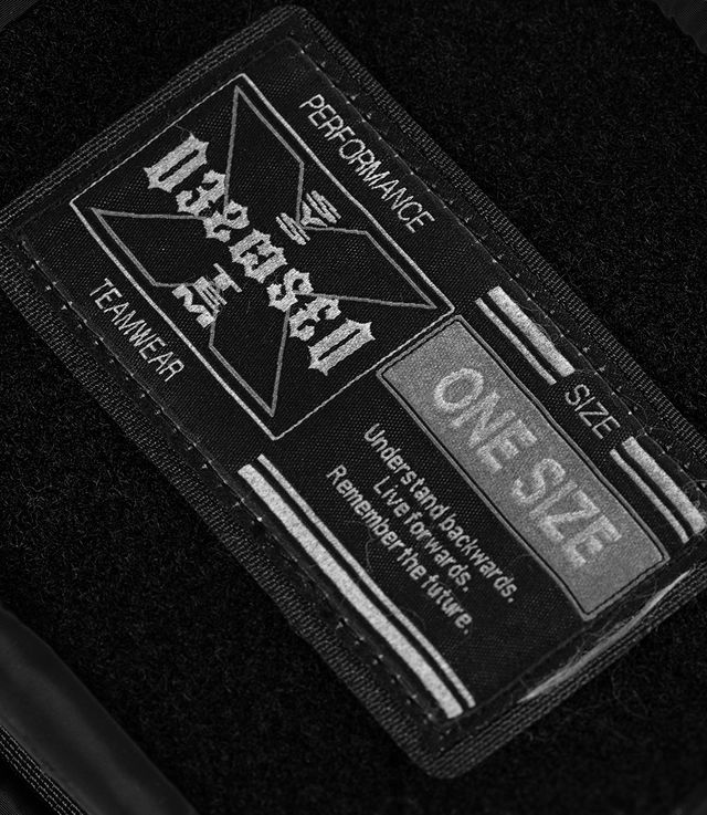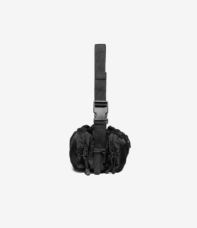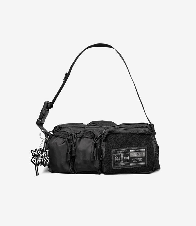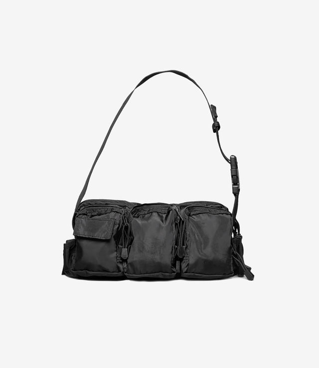 Mediume shoulder bag equipped with various utility pockets on both sides, velcro detailing, and 032c Performance Teamwear label. Adjustable shoulder strap allows different styling options. Treated with a vintage feel and heavy metal hardware. Nylon fabric with a subtle sheen and luxurious look.