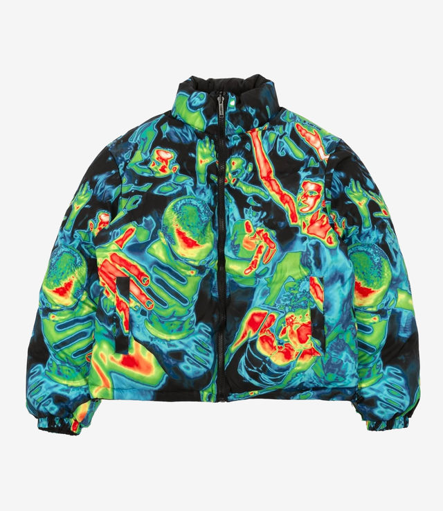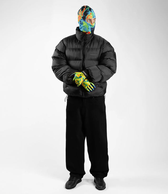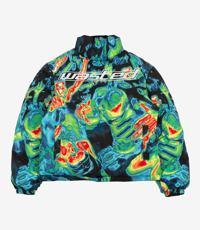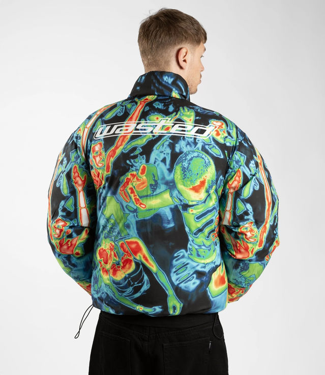 Wasted Paris Fusion puffer is made of nylon fabric. It features the Pulse logo printed on the front and back with a high density technique. The down jacket is reversible with sublimation printing. Elastics with stoppers are located at the bottom of the body to adjust the piece. It has two zipped pockets on the sides.