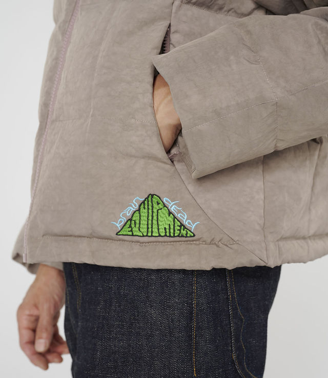 Brain Dead cropped, hooded box-quilt puffer jacket with zippered pockets and a water repellant finish. Features Brain Dead Equipment embroidery above the front left-side hem and embroidered dimension graphic on the back.