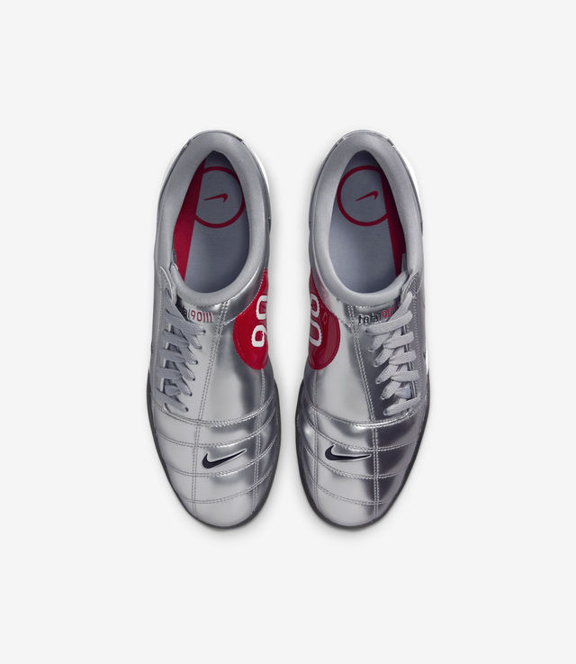 Nike's Total 90 III 'Metallic Silver' edition pays authentic tribute to the iconic 2007 model worn by football legends like Wayne Rooney, Luis Figo, and Roberto Carlos. The upper features the bold metallic silver finish fans remember, with the striking red '90' motif on the medial side, just like the originals. A white midsole keeps the design clean, and the black rubber outsole ensures the same durability and traction that made these boots a favorite on the pitch almost two decades ago.