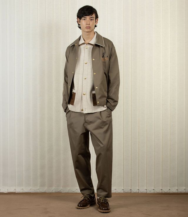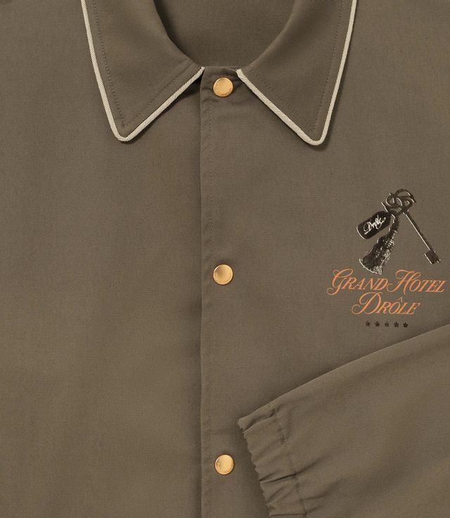 This taupe cotton overshirt-style jacket features raglan pockets with cotton piping, a shirt collar with piping, the Grand Hôtel print on the chest and back, five engraved snap buttons, and elasticated finishes at the hem and cuffs.