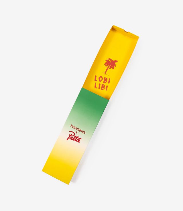 The Patta x Havaianas flip-flops come in two colourways: black and white as well as forest green and yellow. The flip-flops come in a fully custom Patta x Havaianas green and yellow box, made from cardboard with a built-in hanger. The design features co-branding. Inside the box, a palm tree and the words “Lobi Libi” are printed, bringing a personal layer to the packaging, referencing Patta heritage and the spirit of love and life that runs through the campaign.