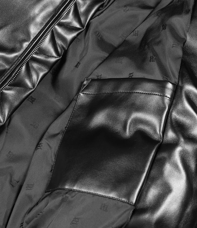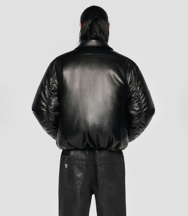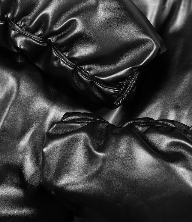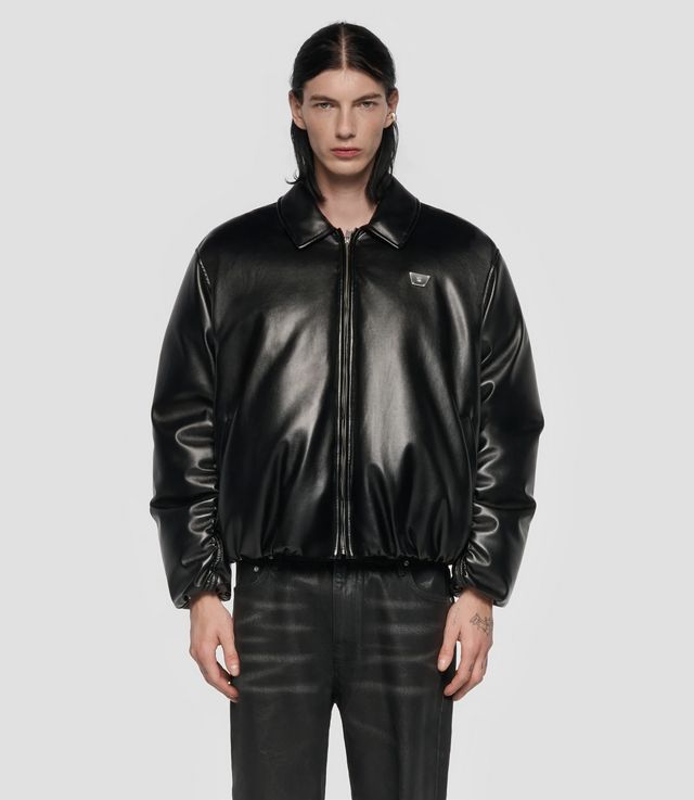 - Faux leather puffer jacket in black.