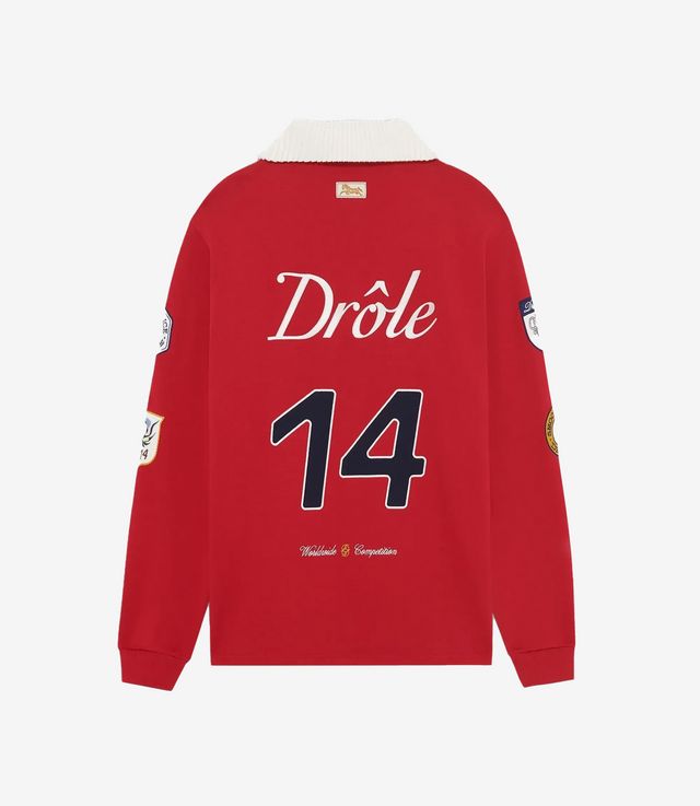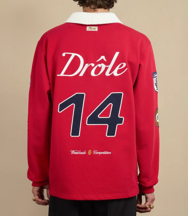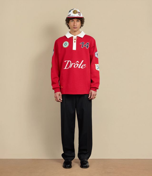 This red 100% cotton long-sleeved polo is decorated with patches and a 'Drôle' embroidery on the front and back. It has a contrasting ribbed collar and button placket as well as ribbed cuffs.