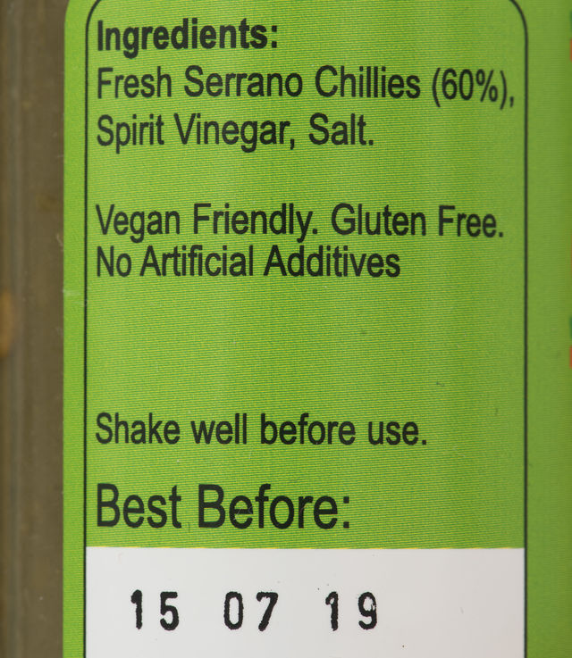 Ingredients: Fresh Serrano Chillies from brand’s farm (60%), cider vinegar, fresh lemon juice, salt.
